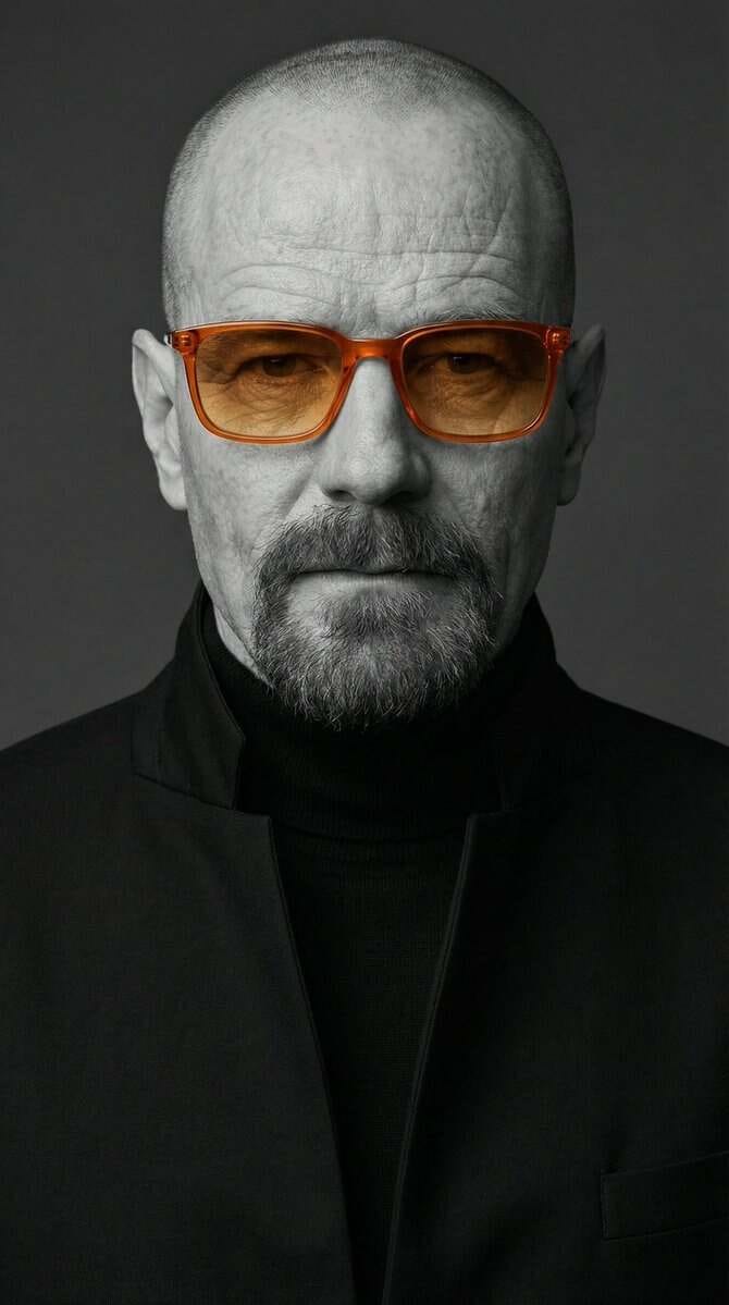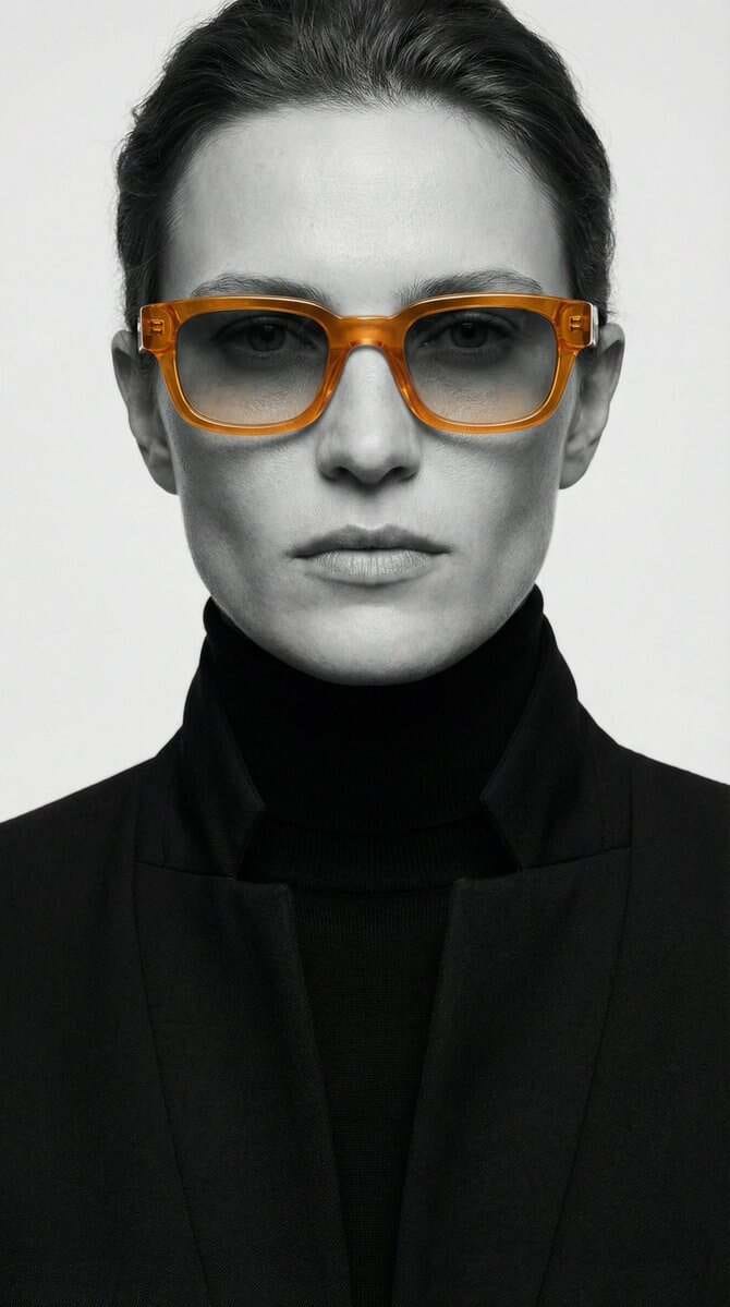 A studio-style close-up editorial portrait of a person with strong, well-defined facial features and slightly imperfect, natural skin texture. The subject wears a black tailored turtleneck with sharp, clean lines, layered under a high-collared black jacket in a minimalist contemporary fashion style.The subject wears semi-transparent orange acetate sunglasses — rectangular frames with softly rounded edges, glossy finish, and amber gradient lenses — serving as the only colored element in the image.Color concept: selective color photography — monochrome black-and-white image with only the sunglasses in vivid orange.