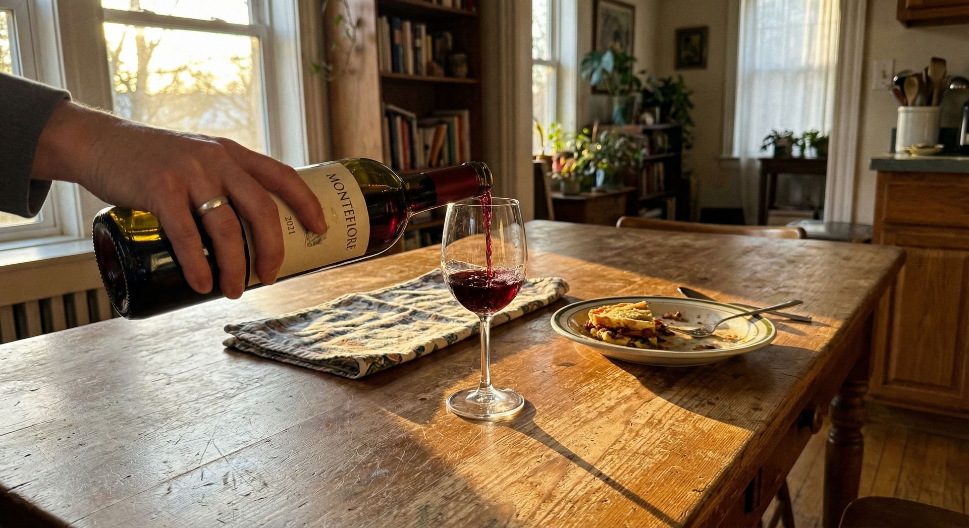A realistic, candid POV shot of a hand pouring deep red wine into a glass on a wooden kitchen table. Soft evening sunlight coming through a window, authentic home interior, shot on iPhone 15, slightly grainy, natural colors, high detail, 8k